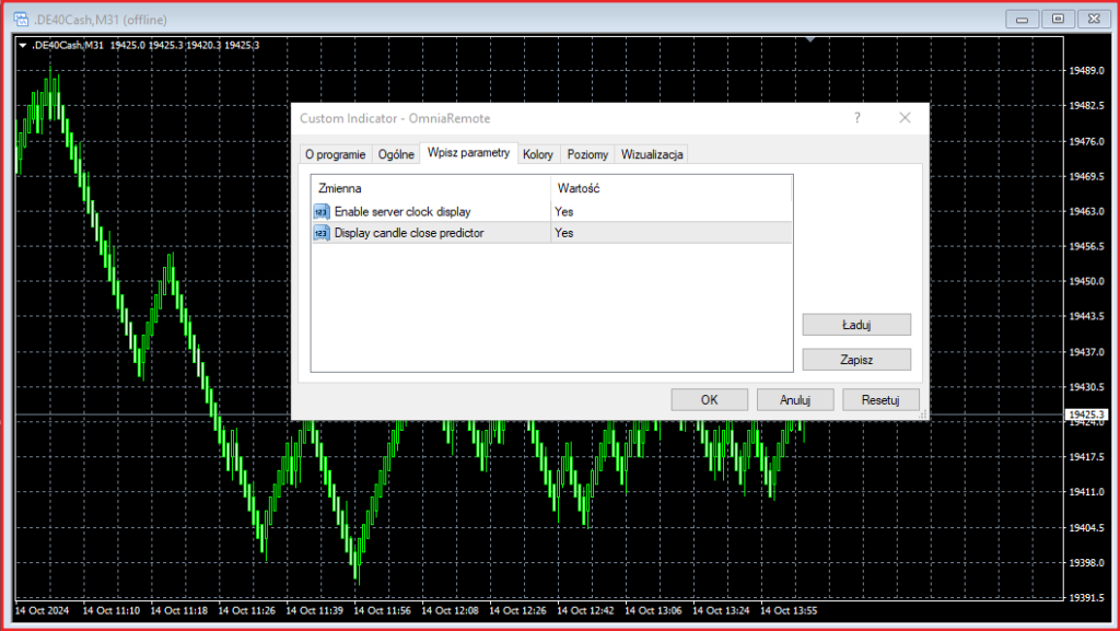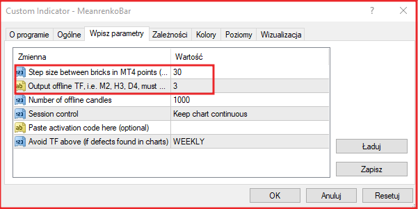 Po skopiowaniu plików do odpowiedniego katalogu zamknij, a następnie uruchom ponownie platformę MT4. Uruchom MeanrenkoBar przeciągając go do okna wykresu z Nawigatora lub klikając go dwukrotnie. Po skonfigurowaniu MeanrenkoBar ustawienia można zapisać jako plik ustawień. W ustawieniach należy wybrać wielkość box-a Mean Renko oraz oznaczenie wykresu offline i kliknąć OK.