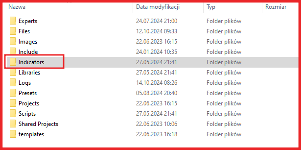 (Plik >> Otwórz Folder Danych/ MQL4 / Indicators)
