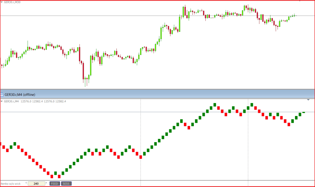 Do budowy systemu handlowego użyjemy świec (bloków) Mean Renko, które są odmianą standardowych świec Renko